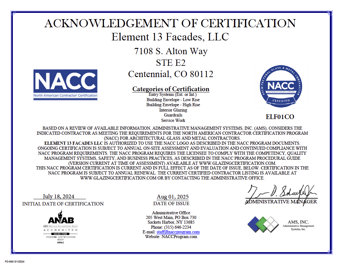 Element13 earned NACC certification - the industry's highest standard for glazing contractors. This certification proves our team has the advanced skills and proven processes needed to deliver exceptional results on every project, from complex curtain walls to specialized repairs.
